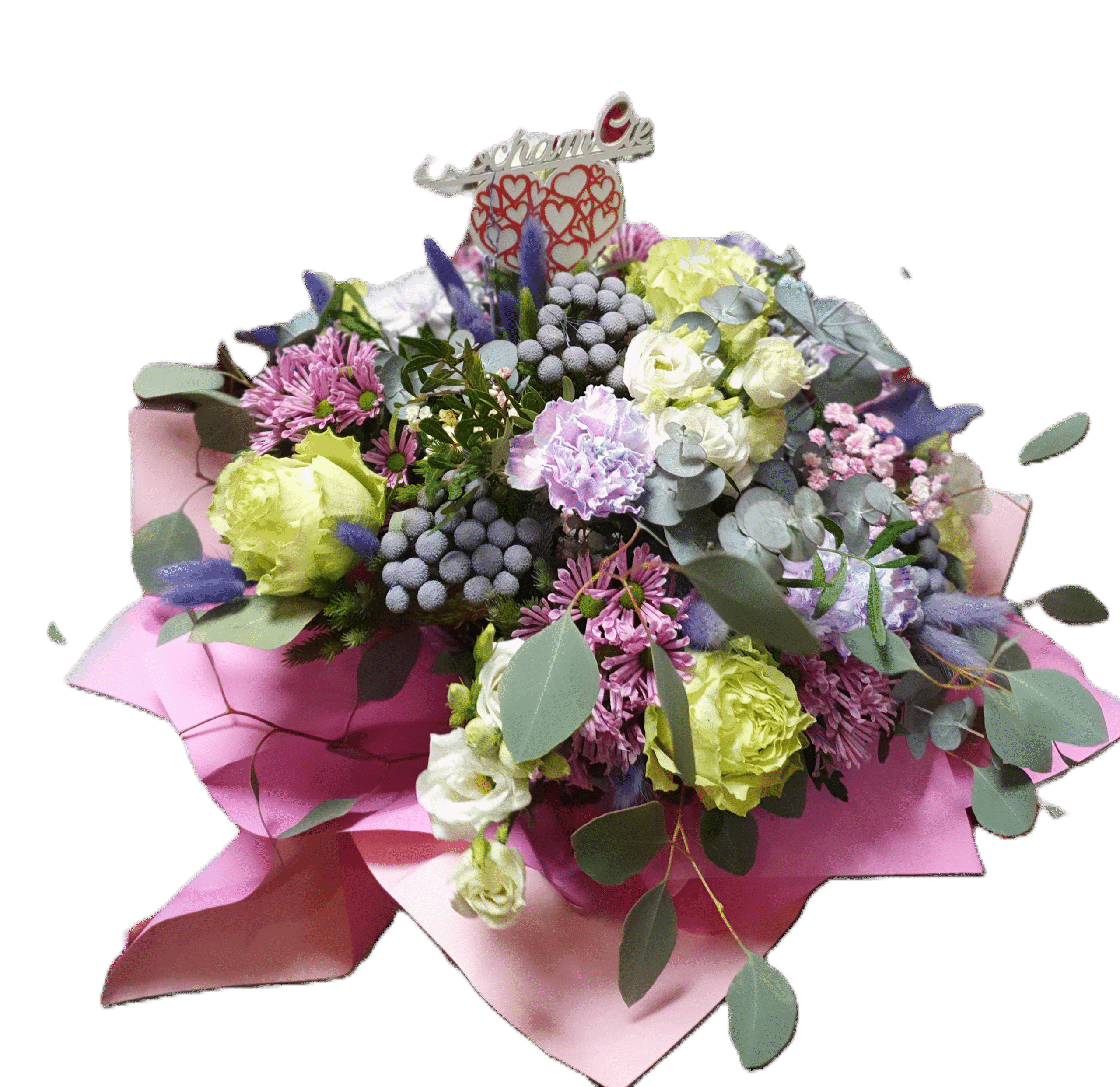 Bukiet składa się z eustomy w odcieniach bieli i zieleni, goździków, drobnych margaretek, brunii oraz eukaliptusa. Całość uzupełniona dekoracyjną zielenią i zapakowana w różową ozdobną folię.